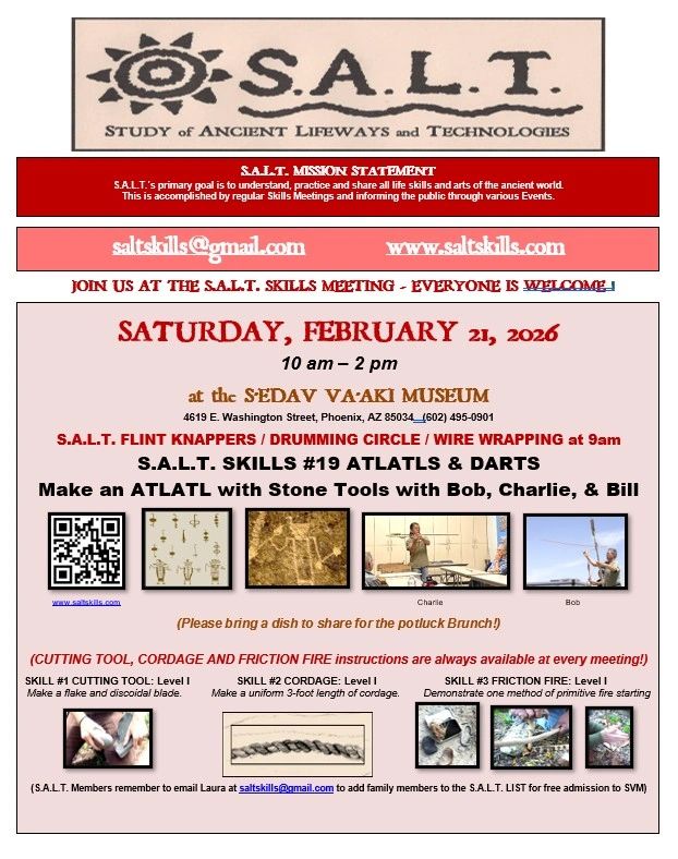 S.A.L.T. is a diverse group of people with a desire to understand their ancestor’s life skills. Regular friendly gatherings are held on the third Saturday of each month to help each other to become proficient in skills such as Cordage, Fiber, Friction Fire, Bone and Stone Tool production, Shelter, Archery, Atlatl and much more...